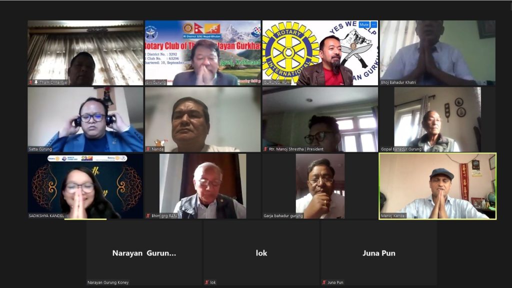 The Rotary Club of the Himalayan Gurkhas was chartered on 10th September 2003. The 18th Charter Day of the Club was celebrated on 10th September 2021 virtually due to global pandemic. The Chief Guest of this event was Assistant Governor Rtn. Manoj Kandel. Likewise, Charter President Rtn. Maj. Gopal Gurung, Past President Rtn. Maj. Lil Gurung, Past President Rtn. Maj. Bhim Gurung, Past President Rtn. Narayan Gurung, Past President Mr Yubaraj Gurung, Past President Krishna Adhikari, Immediate Past President Rtn. Siri Gurung, President of the Rotaract Club of the Peoples Campus Rtr. Mr. Manoj Shrestha, President of the Interact Club of Valley Public School Ms. Numa Thebe were also present in the event.