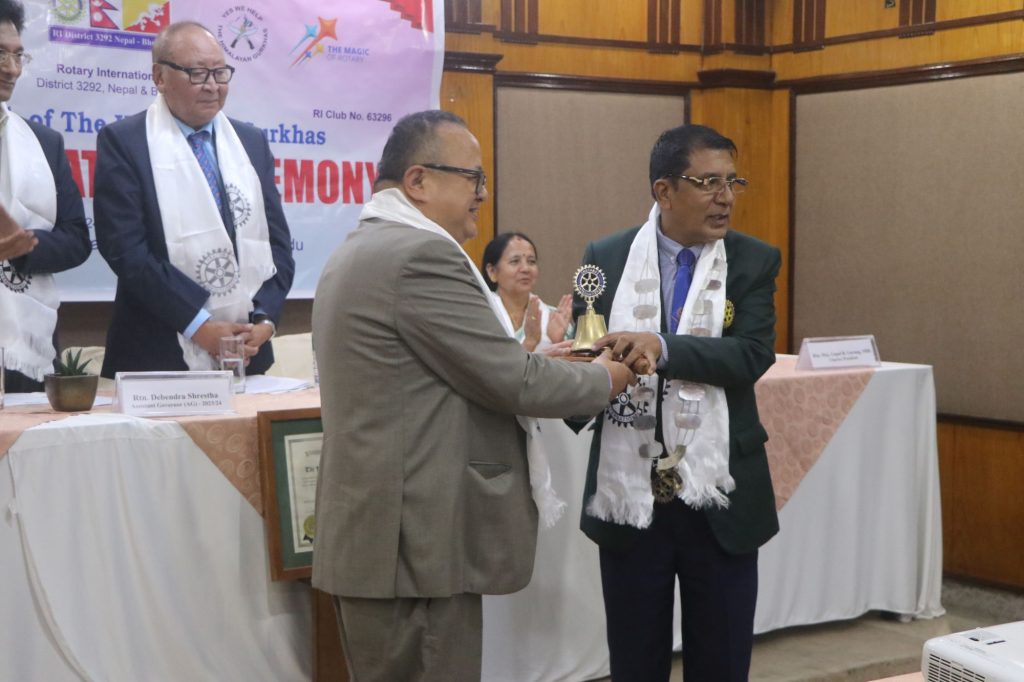 Chief guest AG Rtn. Arun Man Sherchan offered Collar (Mala) to the new President. Likewise, Charter President Rtn. Major Gopal Bahadur Gurung, MBE handed over the Charter Certificate to the incoming President and IPP Rtn. Satta Bahadur Gurung handed over the Gavel and Gong to the new President Rtn. Mr Khatri. Chief Guest AG Rtn. Arun Man Sherchan further conducted oath taking ceremony to the new President Rtn. Bhoj Bahadur Khatri. President Rtn. Bhoj Bahadur Khatri introduced his Board of Directors for the Rotary Year 2024/25 and he further conducted oath taking ceremony to the newly formed Board of Directors and standing committee chairs.