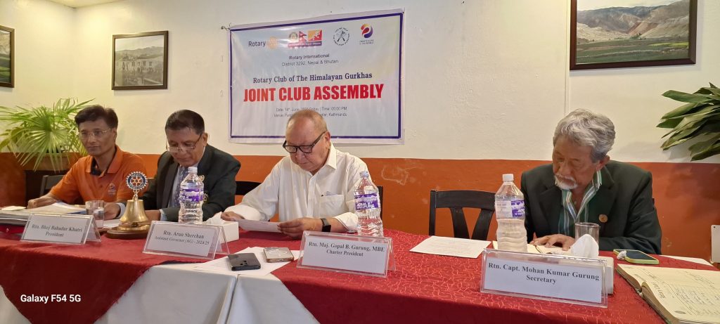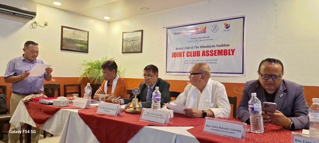 Joint Club Assembly and Rotary Weekly Meeting (RWM) no. 833 was organized on 14th June 2024. President welcomed AG Rtn. Debendra Shrestha (RY 2023/24) and AG Rtn. Arun Sherchan (RY 2024/25) in the joint Club Assembly.