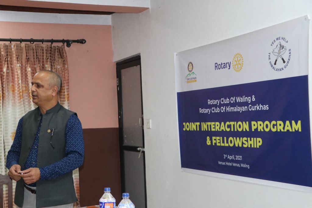 Joint Interaction and Fellowship meeting was held between Rotary Club of Waling and Rotary Club of The Himalayan Gurkhas at Hotel Venus, Bhakunde, Waling, Shyangja on 3rd April 2021. President of RC Waling, Rtn. Somu Rana hearty welcomed all the members from RC the Himalayan Gurkhas. President of RC The Himalayan Gurkhas Rtn. Siri Gurung introduced their members and briefly described regarding various projects of the Club. Both president exchanged their club flags during the fellowship meeting.
