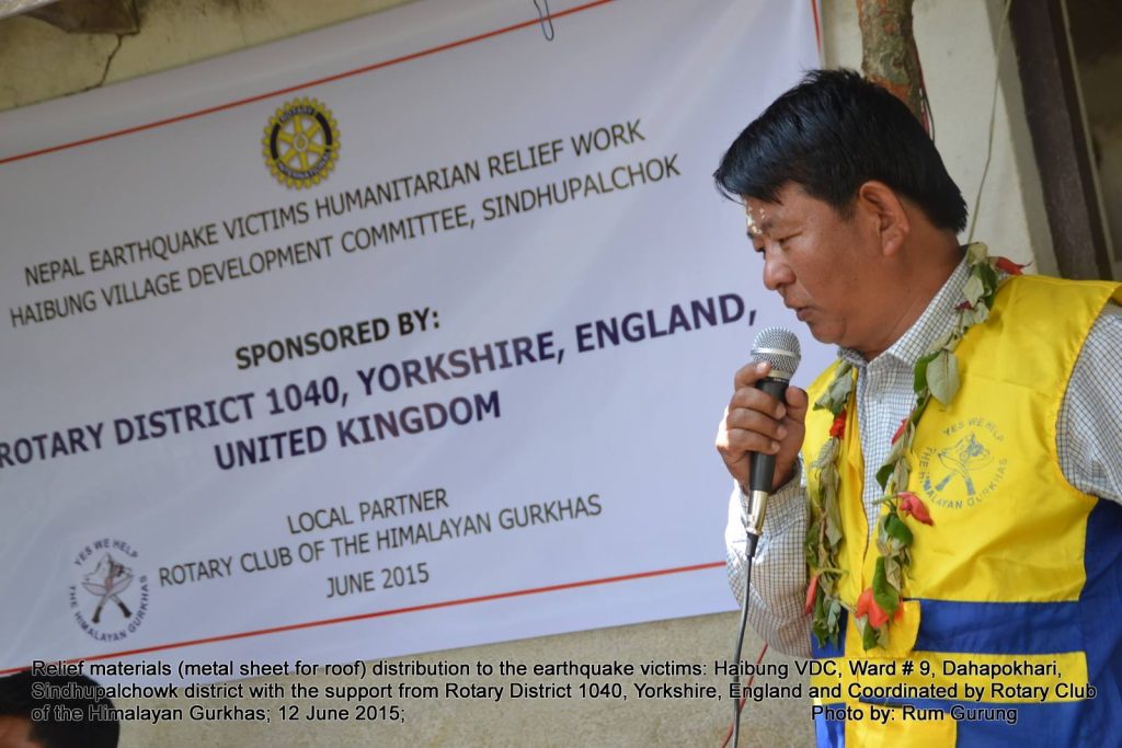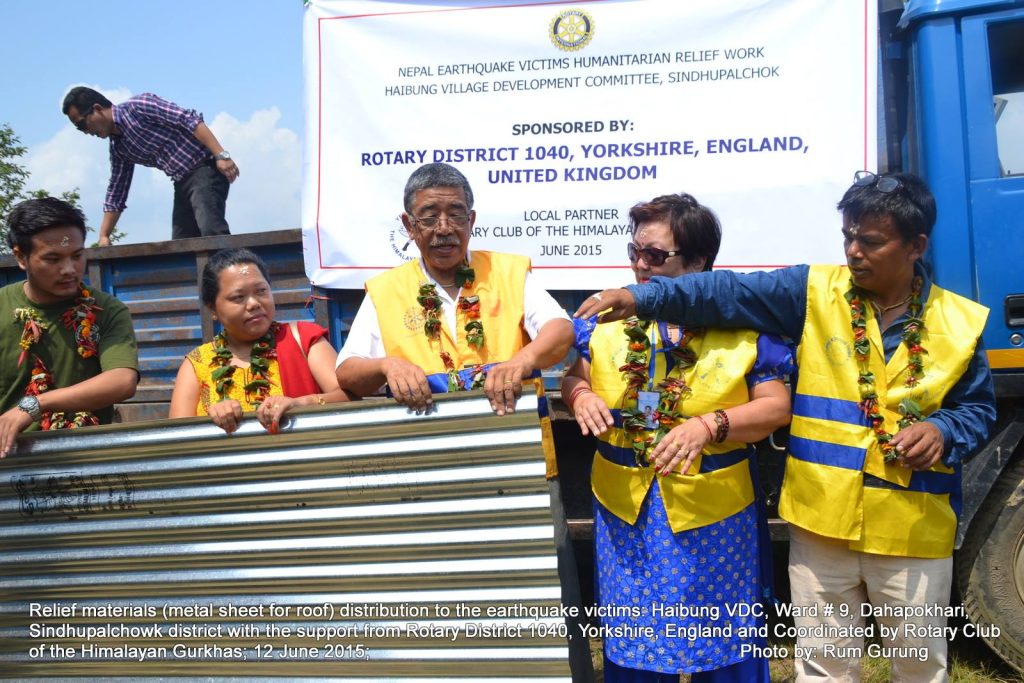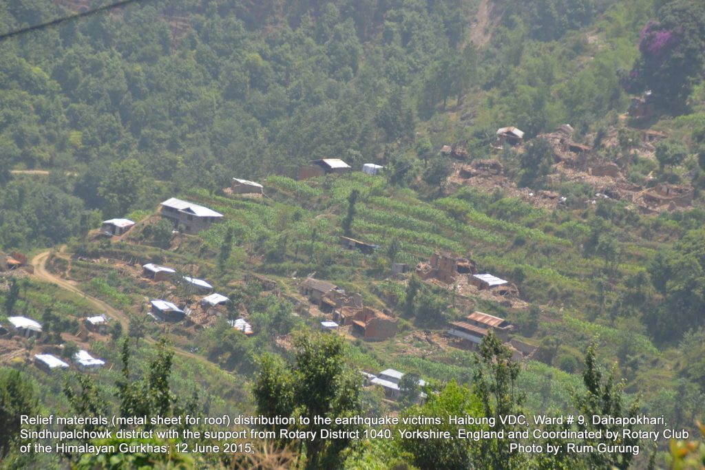 Relief material distribution and cultural programme was organized on 12th June 2015 at Haibung-9, Sindhupalchowk district.  Financial support received from the Rotary District 1040, Yorkshire, England which has been used for earthquake relief works in different places in Nepal. The local partner to support for this activity was ‘Rotary Club of The Himalayan Gurkhas’. The club distributed 1.5 bundle (14 sheets for each family) metal sheet to 84 families/victims of the Haibung VDC Ward # 9, Dahapokhari village of Sindhupalchowk district.